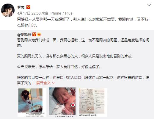 对此,伊能静心疼发文维护丈夫:“看到网友为我们吵成一团,我真心道歉,这一切不是网友的问题,还是角度选择的问题。 真的跟网友无关,没有那么多黑心的人,很多人只是说出他们看到的片断。 今天很难受,原本想给一家人美好回忆,好像走偏了。 赚钱的节目有一百种,但黑自己家人给自己赚钱再回家一起花,这种扭曲的财富, ?脱离了我的初心。”她更表示:“秦先生背了黑锅,他笑说无所谓,娱乐嘛。但他越这么说、我越难受。一年八个月没工作,以家为重的我,現在却为這些误导,让简单的家庭生活变得如此复杂。谢谢你们懂秦先生不迎合摄影机的生活表演。”
