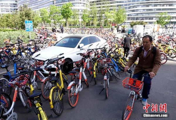 4月18日,北京,一辆私家车被各家公司、不同颜色的“共享单车”包围。近来,“共享单车”在方便市民出行的同时,缺乏停车管理等问题也逐渐显现。 中新社记者 侯宇 摄