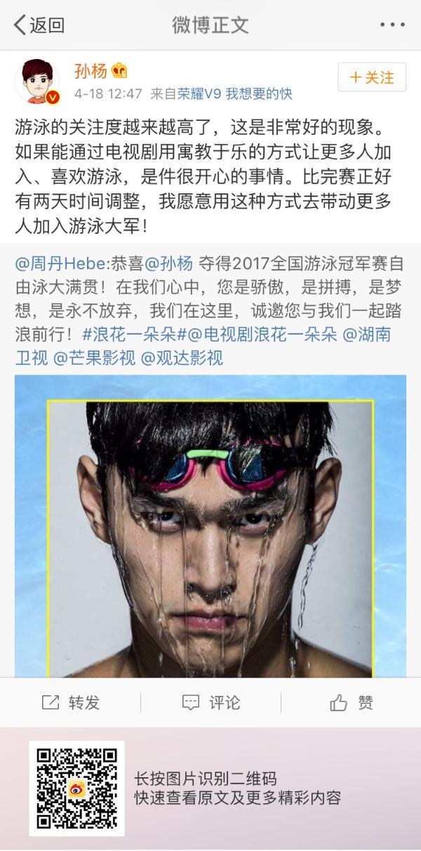 而今日12点多,刚刚在比赛中夺冠的孙杨转发该微博,并回应邀约:“游泳的关注度越来越高了,这是非常好的现象。如果能通过电视剧用寓教于乐的方式让更多人加入、喜欢游泳,是件很开心的事情。比赛完正好有两天时间调整,我愿意用这种方式去带动更多人加入游泳大军!”这一回应,意味着孙杨将首次以参与电视剧的方式推广游泳,而观众也将在《浪花一朵朵》中见到孙杨亮相。