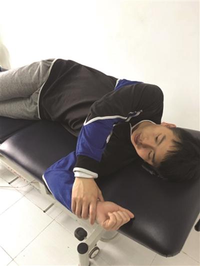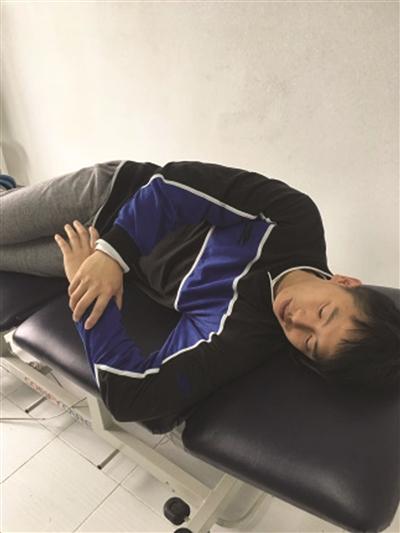 仰卧,右肩向内旋转活动度受限,能够达到约10°,出现疼痛;