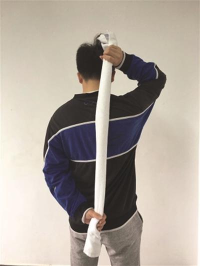 将浴巾纵向卷成棍状;症状较轻一侧的手,抓住浴巾一端,从背后垂下;症状明显一侧的手,从下面握住浴巾;上面的手缓慢上拉,带动下面的手向上。