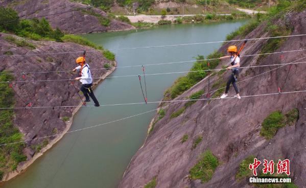 4月18日,湖南平江石牛寨悬崖“飞拉达”正式开通,首批体验的游客犹如“蜘蛛侠”,行走在悬崖峭壁上感受高空刺激。杨华峰 摄