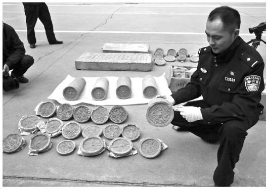 图①民警整理收缴的秦砖汉瓦。