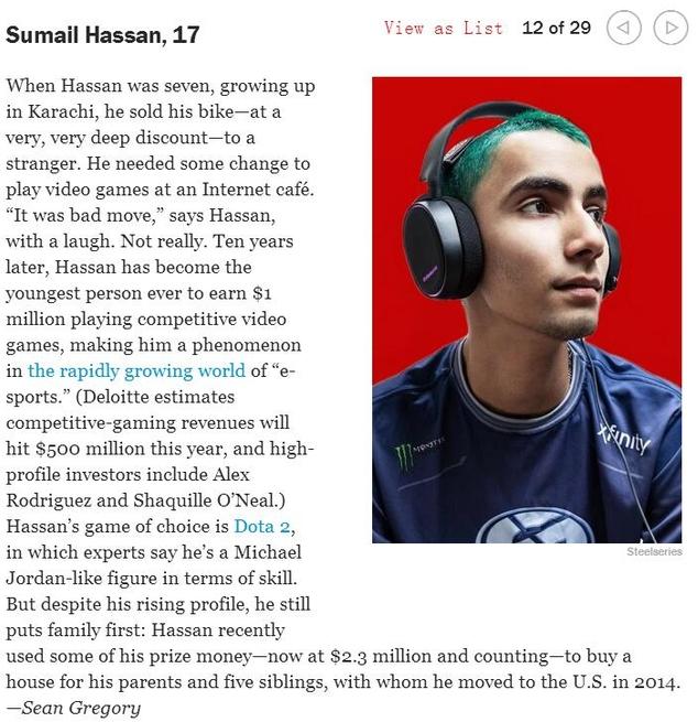国外的情况则有所不同,2016年,美国时代杂志将dota2项目第五届国际邀请赛冠军EG战队的Sumail评价为年度最有影响力的青少年之一,这个最具影响力青年名单提名中还包含当时美国总统奥巴马的两个女儿Sasha Obama和Malia Obama、奥运金牌得主Simone Biles等等。
