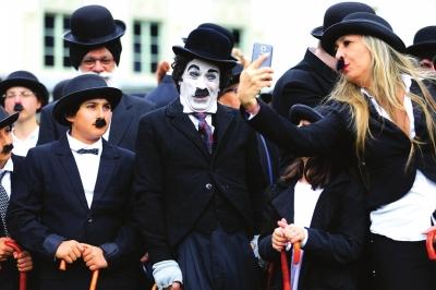 当地时间16日,数百名粉丝以查理·卓别林的经典银幕造型聚集在他的瑞士故居,纪念这位喜剧大师诞辰128周年。