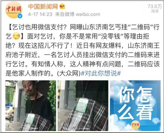 有网友爆料说,山东济南王府池子附近,一名乞讨人员挂出微信支付的二维码来进行乞讨。有居民说,由于附近都是旅游景点,大多数前来乞讨的人都在使用微信二维码乞讨,更有甚者,带着POS机来乞讨。