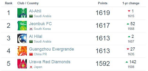 另外一支沙特球队阿尔阿赫利仍然高居亚洲第1,不过领先亚洲第2、韩国的全北现代只有2分的优势。日本的浦和红钻、鹿岛鹿角分别排在亚洲的第5和第6位,阿联酋的阿尔艾因、泰国的蒙通联、卡塔尔的莱赫维亚、伊朗的波斯波利斯分别排在亚洲的7-10位。