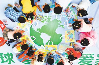 4月18日,在安徽省合肥市瑶海区三里街街道凤阳一村社区一幼儿园,孩子们用画笔在空白环保袋上手绘环保主题画。