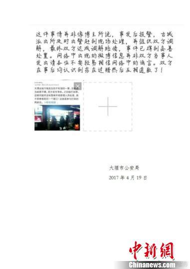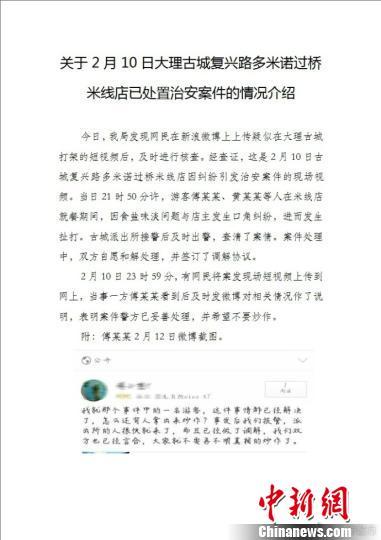 大理市公安局通报称,该局发现网民在微博上传疑似在大理古城打架的短视频后,及时进行核查。经查证,该视频是2月10日大理古城复兴路多米诺过桥米线店因纠纷引发治安案件的现场视频。当日21时50分许,游客傅某某、黄某某等人在米线店就餐期间,因食盐味淡问题与店主发生口角纠纷,进而发生扯打。古城派出所接警后及时出警,查清了案情。案件处理中,双方自愿和解处理,并签订了调解协议。
