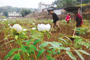 初春的郊外细雨蒙蒙,简阳市平泉镇黄岭村一组,138亩洁白的油牡丹开得正旺。黄岭村村委会副主任李文平指着油牡丹中高出来的树告诉记者,那是套种的500多窝美国山核桃,今年就能结果。