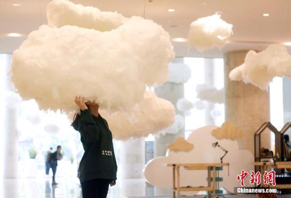 4月20日,主题为“轻生活”的装置艺术展亮相南京德基广场,通过轻盈质感“漂浮的云”令每一位路人都可以将头“置入”云中,或放松或冥想,或思考或天马行空地做梦和幻想,以此营造轻松惬意、释放自我的美学空间,倡导用最静的心去体会事物最初的美好。中新社记者 泱波 摄