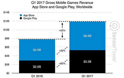 上周,移动应用数据分析公司Sensor Tower发布了本年度Q1移动游戏的统计报告。数据显示,2017年第一季度App Store和Google Play的手游部分收入达到了119亿美元,相比2016年Q1的78亿收入同比增长了53%。