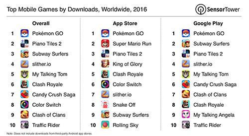 从下载量上来看,Q1两大应用商店均有稳定增长,App Store和Google Play的总量约为88亿,与2016年Q1的76亿下载量相比增长了15%而如果从具体的产品情况着眼,第一季度大体上还是在延续以往休闲游戏霸榜基础上的小幅变动。