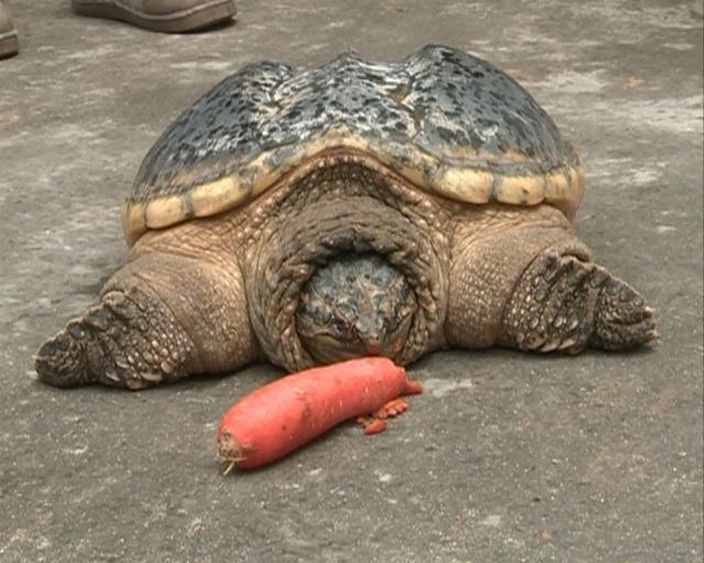 陈先生说,这只乌龟捡回来之后,他们相继将泥鳅、猪肉、胡萝卜喂给乌龟吃,但是乌龟都拒绝食用。随后,陈先生还当着记者的面给乌龟喂食胡萝卜,这只乌龟张开大嘴,咔嚓一声就将胡萝卜咬断,显得非常凶猛。