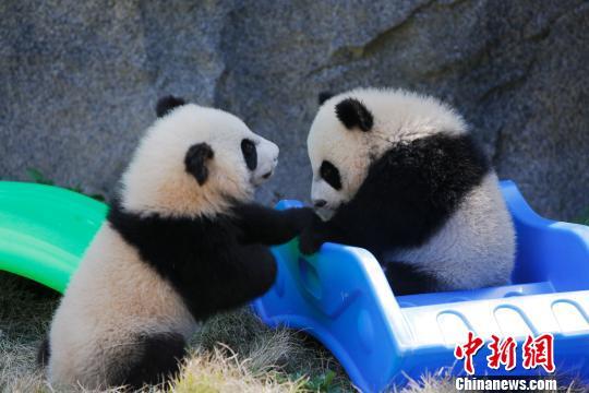 在上海野生动物园诞生的首对大熊猫龙凤胎22日有了名字,哥哥名叫月月,妹妹名叫半半。 黄全 摄