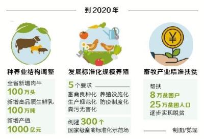 在脱贫攻坚中,我省畜牧业将强化精准扶贫,立足各地资源禀赋和产业基础,将新增产能重点向贫困地区布局。组建省市县畜牧专家服务团,提高贫困户养殖技能。鼓励龙头企业到贫困地区建设生产加工基地,带动专业合作组织和贫困户建设养殖基地,吸纳和带动贫困人口就业。通过畜牧产业精准扶贫,到2020年,帮扶8万贫困户、25万贫困人口逐步实现脱贫。③5