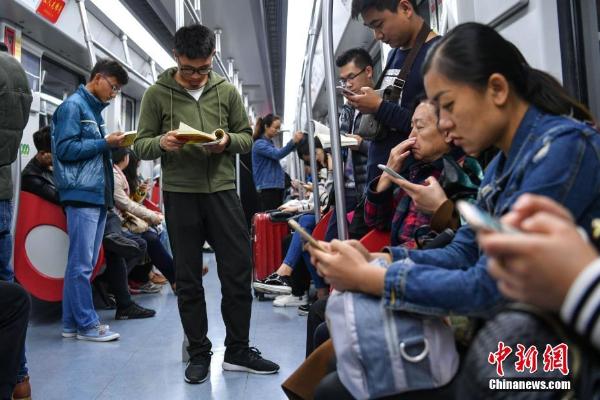 4月23日世界读书日,昆明20多名志愿者在昆明地铁内上演“读书快闪”,以此呼吁民众“少玩手机多读书”。据了解,这是《春城地铁报》联合多单位、部门组织发起的世界读书日相关活动,旨在营造一个良好的“书香昆明”氛围。 中新社记者 任东 摄
