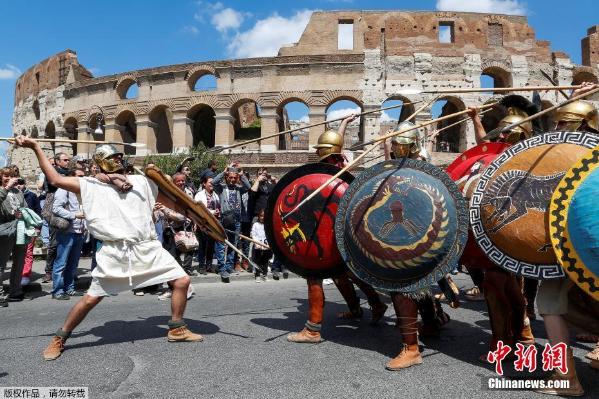当地时间4月23日,意大利罗马迎来2770岁生日,历史爱好者身着古罗马时代当地士兵和民众的服装,参加庆祝活动。图为历史爱好者手持长矛和盾牌,在罗马斗兽场前。