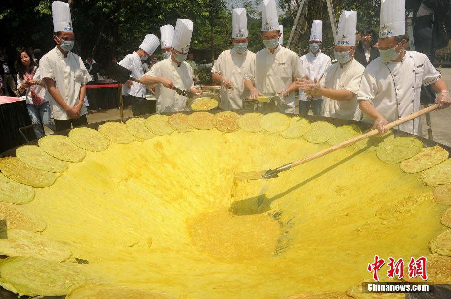 2017年4月23日,广东十多名厨师挥舞铁铲大勺,在一口3米巨锅煎炸出巨无霸的藤三七煎蛋,场面极其欢腾。 中新社记者 陈军 摄