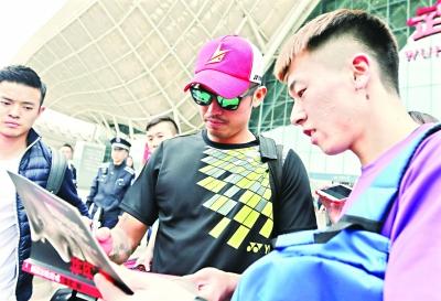 昨日,林丹在武汉火车站给球迷签名 记者李葳 摄