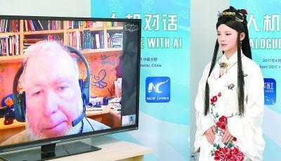 4月24日,机器人佳佳通过网络与科技观察家凯文·凯利对话。新华社发