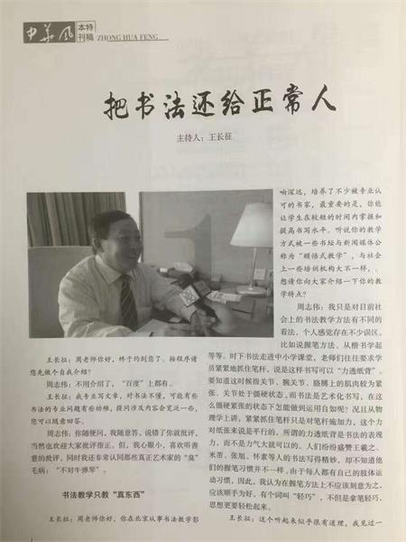 周志伟: 说明一点,我没获过什么大奖,书写水平更说不上好。为社会做了一点成绩通过媒体等各种途径宣传出去了,纯属意外,不免沾沾自喜,因为书法教育是美德,是正能量。单从个人表现上来衡量也是对我的一种鞭策,媒体的作用就是通过宣传给人以启发。树立一个标杆,可以提醒更多的人分清善恶,感召引领带动更多的人。艺无止境,我正处于不断提升自身的阶段,希望有更多的机会在书法艺术这条路上走得更远,拥有更多探索的机会和时间。