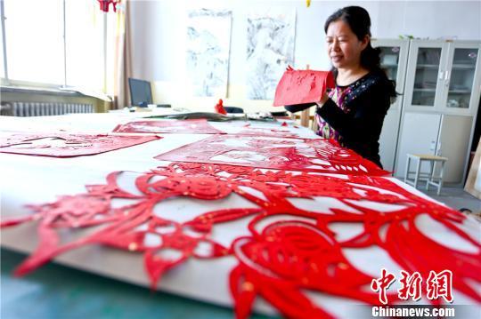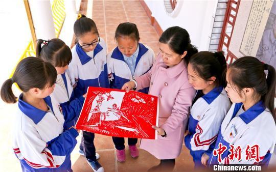 指导老师在制作教学剪纸作品。 王将 摄