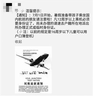 “温馨提示:7月1日开始,暑假准备带孩子乘坐国内航班的朋友请注意啦!凡12周岁以上乘机必须要身份证了,尚未办理的请速去户籍所在地派出所办理正式或临时身份证。”最近,一些旅行社工作人员相继在微信朋友圈发送这样的提示信息,引起很多市民关注。