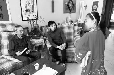 谭老爷子如今和儿子谭立曾住在一起,记者到谭家拜访时,正赶上谭元寿的孙子、谭孝曾之子、谭门第七代传人谭正岩也来到家中看望爷爷。而家中保姆的女儿媛媛刚好也从北京京剧院录像归来,小姑娘穿着戏装又给谭老爷子演了一段,90岁的谭元寿则亲自给这个8岁的小女孩打板。小姑娘一招一式有模有样,老爷子一板一眼也是极为认真,谭立曾和谭正岩则在一旁认真观看,时不时还给媛媛提点意见。从小生活在谭元寿身边的媛媛,从1岁多就开始看戏,五岁便开始正式学戏,每天都能得到被她称做“老祖”的谭元寿亲自指点。