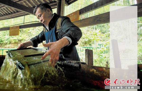 跨过潺潺溪水,竹林深处传来“沙沙”的抄纸滤水声,作坊中,刘俊杨一边用纸帘娴熟地抄起一张张散发着竹香的草纸,一边向记者介绍蔡伦造纸工艺的五道工序:斩竹漂塘、煮篁足火、荡料入帘、覆帘压纸、透火烘干。