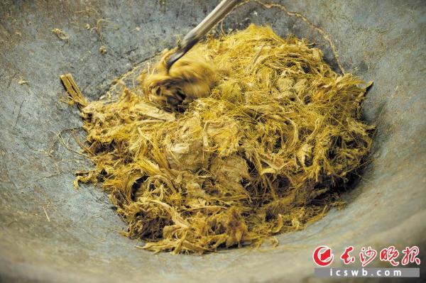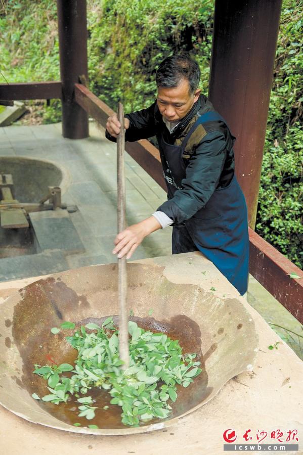 山胡椒叶是制纸药的原材料,采回来后放入水里不停搅拌蒸煮,直到成为一种绿色黏稠性液体,用来润滑纸浆。