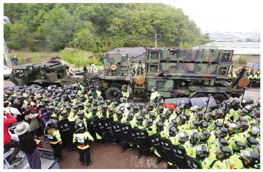 据报道,韩国警方本次动用了8000余名警力,封锁了韶成里会馆和通往星州高尔夫球场的905国道。在星州高尔夫球场的入口处星州郡草田面韶成里会馆前,警察阻挡了200余名反对部署的居民。而写着“NO THAAD”“NO WAR”(不要萨德,不要战争)等反对标语的旗子、横幅一路悬挂在运送的路上。