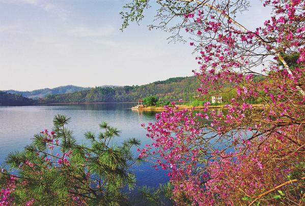 五月的龙湾,崖间杜鹃香韵,碧空莺燕啼歌,湖水清澈深邃,林间曲径通幽。