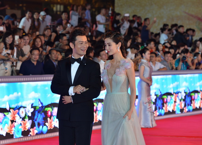 演员黄晓明(左)、杨颖亮相红毯秀