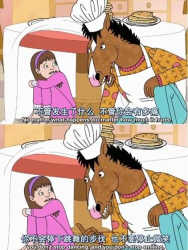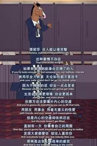 在看似毒舌的利剑之下,《马男波杰克》揭示的是令人醒神、发人深思的生活本相。它也许有些残酷,有些刺眼,然而早些明白,却会被一直活在鸡汤里要好。正如《马男波杰克》里的一只猴子所言:“事情每天都会变得更容易一点,但是你每天都得去做——这才是困难所在。然而事情的确会变容易。”或许这就是为什么悲伤更适合用喜剧去探讨的原因:喜剧里面也有真实,可以说的更少而表达的更多,而且喜剧的悲喜交织比任何单纯的悲惨戏剧更加接近真实生活。哈哈,说的有点沉重了,那咱们就通过《马男波杰克》的一连串台词,来再次感受一下这部片子独特的台词和文化魅力吧。