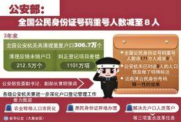 据新华社电 3年来,全国公安机关共清理重复户口306.7万个,清理应销未销户口212.5万个,纠正登记项目差错1101万项,全国公民身份证号码重号人数由171万人减至8人,公安机关已对这8人的人口信息做了特殊标注,达到其公民身份号码唯一性的效果。