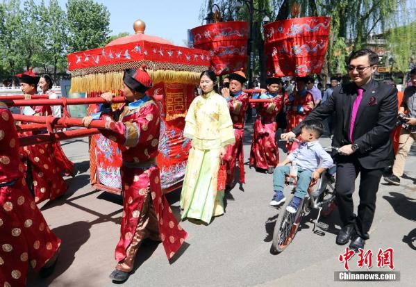 4月28日,北京一对新人在什刹海举行婚礼,新郎用喜轿迎娶新娘,吸引路人围观。中新社记者 张宇 摄