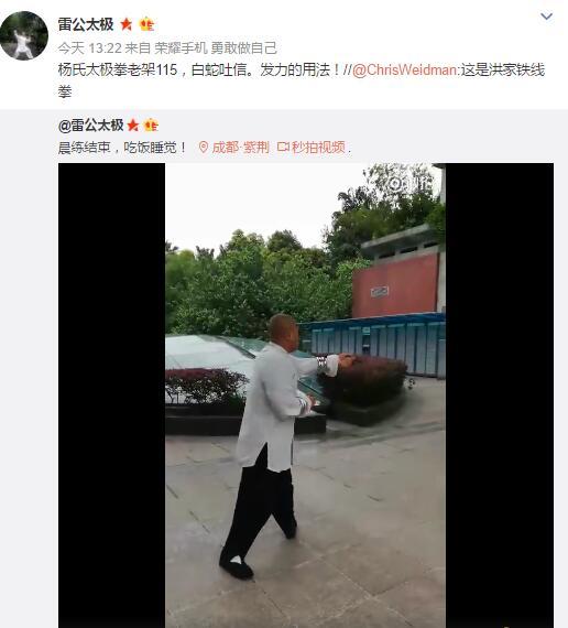 代表传统武术出战的是今年41岁,自称雷雷的选手,据说此前在北京什刹海体校练过散打,学过杨式太极,之后自己创设了一个门派,叫做雷公太极,曾经扬言可以单手破解搏击当中裸绞,让人半信半疑。