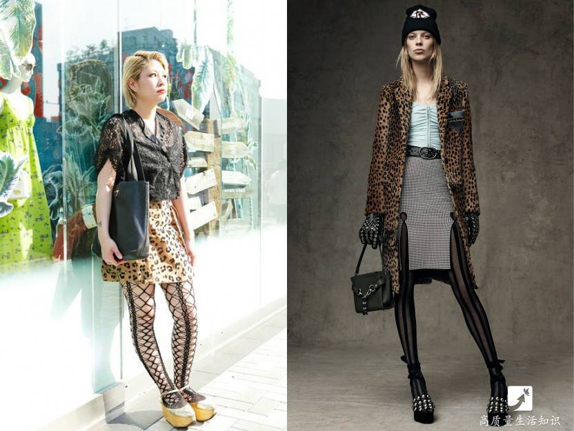 豹纹搭配竖条花丝袜