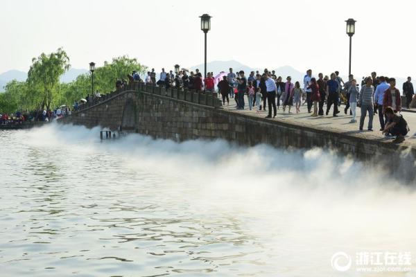 4月28日下午,西湖断桥的“雾森”在工作人员的检修后重新试放。在五一小长假中,“雾森”将陆续喷放,为游客营造出一种仙雾飘渺的幻境。(浙江在线 里尔 摄)