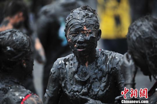 图为被涂满泥浆的市民。 刘冉阳 摄