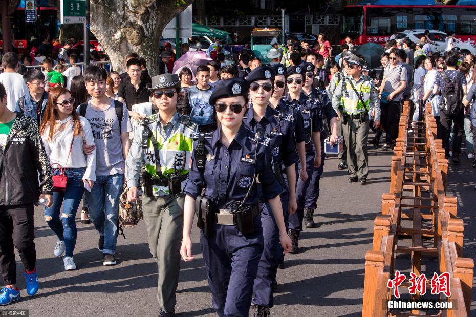 2017年4月29日,五一小长假首日,杭州西湖景区断桥景点,游人比肩接踵,只见人头不见桥头。从上午开始,杭州西湖景区就进入了游客“高峰模式”。清一色的贝雷帽、墨镜、蓝牙耳机、执法记录仪……