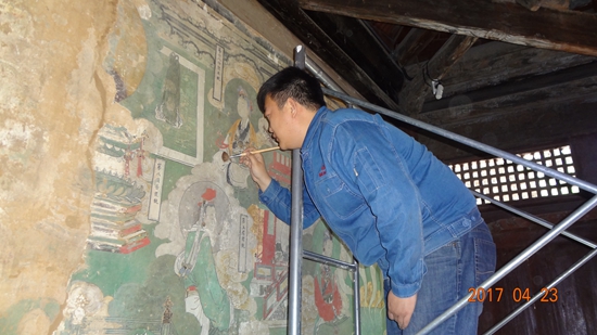 2017年4月,李晓洋在河北石家庄毗寺壁画修复现场。