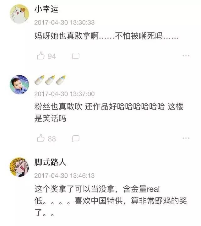 估计这个奖含金量一般,网友对杨幂的评价也是嘲讽多过赞美。
