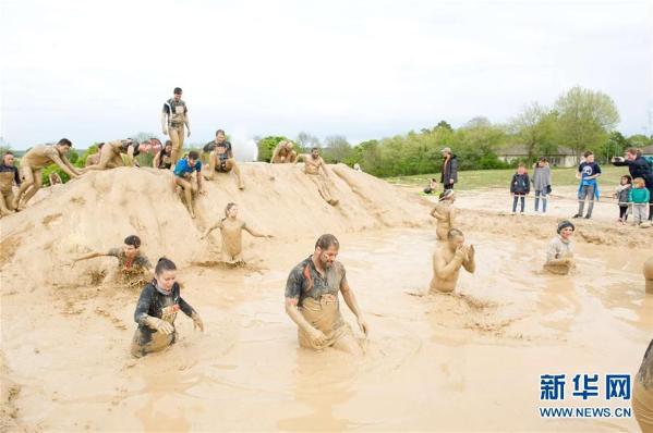 4月30日,在法国贝讷,人们参加“泥巴日”越野障碍赛。“泥巴日”活动是一场妙趣横生,同时考验体力与脑力的越野障碍赛,参赛者要在13公里赛程内进行22个项目的闯关。 新华社/西霸