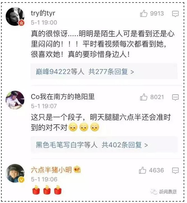 5月1日,有媒体报道称腿腿的同事证实了刘洁去世的消息。而5月1日晚,《陈翔六点半》导演陈翔也在其微博发布了纪念刘洁的视频,该条微博评论在短短几个小时内接近3万,刘洁的同事也纷纷在评论留言。