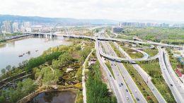 鸟瞰北中环桥与汾河公园,蓝天、白云、碧水美不胜收。 本报记者寇宁摄