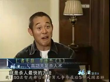 李连杰还说:因为我们不再需要真的功夫了嘛,所谓什么是真的功夫,就是杀人最快的方法,这个在古代,在远过去的时候,人们学武就跟现在上大学似的,十年练一个绝招,一个绝招就是你有了看家本领了,你可以给别人看家护院,你可以保护皇帝,你可以做保镖,就是有地位了。其实在不同的时代里头,大家费那个精力是为了达到生存,如果今天谁练了十年一个东西出来,你举着手去动谁啊,你打谁都犯法。