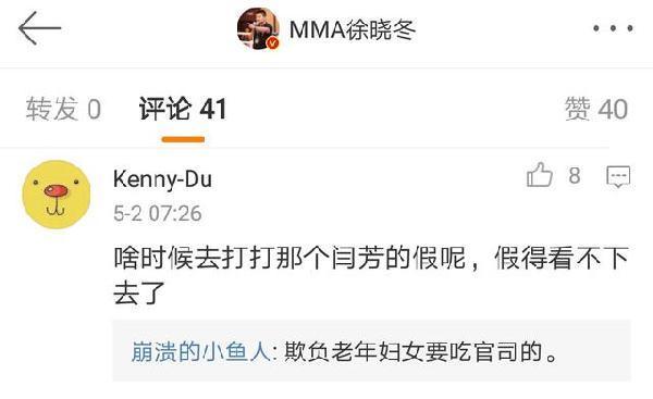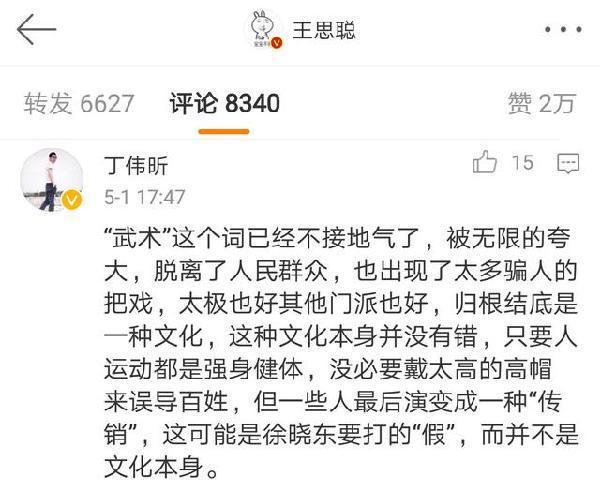 于是,有网友在徐晓冬的微博留言写到,“啥时候去打打那个闫芳的假呢,假得看不下去了”,对此另一位网友回应到,“欺负老年妇女是要吃官司的”,还有网友在王思聪微博下留言,对徐晓冬“打假”事件给出了自己的评析,““武术”这个词已经不接地气了,被无限的夸大,脱离了人民群众,也出现了太多骗人的把戏,太极也好其他门派也好,归根结底是一种文化,这种文化本身并没有错,只要人运动都是强身健体,没必要戴太高的高帽来误导百姓,但一些人最后演变成一种“传销”,这可能是徐晓冬要打的“假”,而并不是文化本身。”