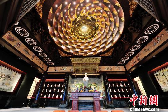 中新网杭州5月3日电(记者 方堃 实习生 胡哲斐)3日,位于浙江杭州的虎跑观音殿试开放,这是中国首个以观音文化和瓷文化为主体的观音殿。主殿以瓷塑观音主像为中心,两侧佛龛内陈设有36尊德化瓷窑的观音法身相。主像观音像高1.9米,连同底座通高3.3米,是目前中国最大的一体成型的观音塑像。